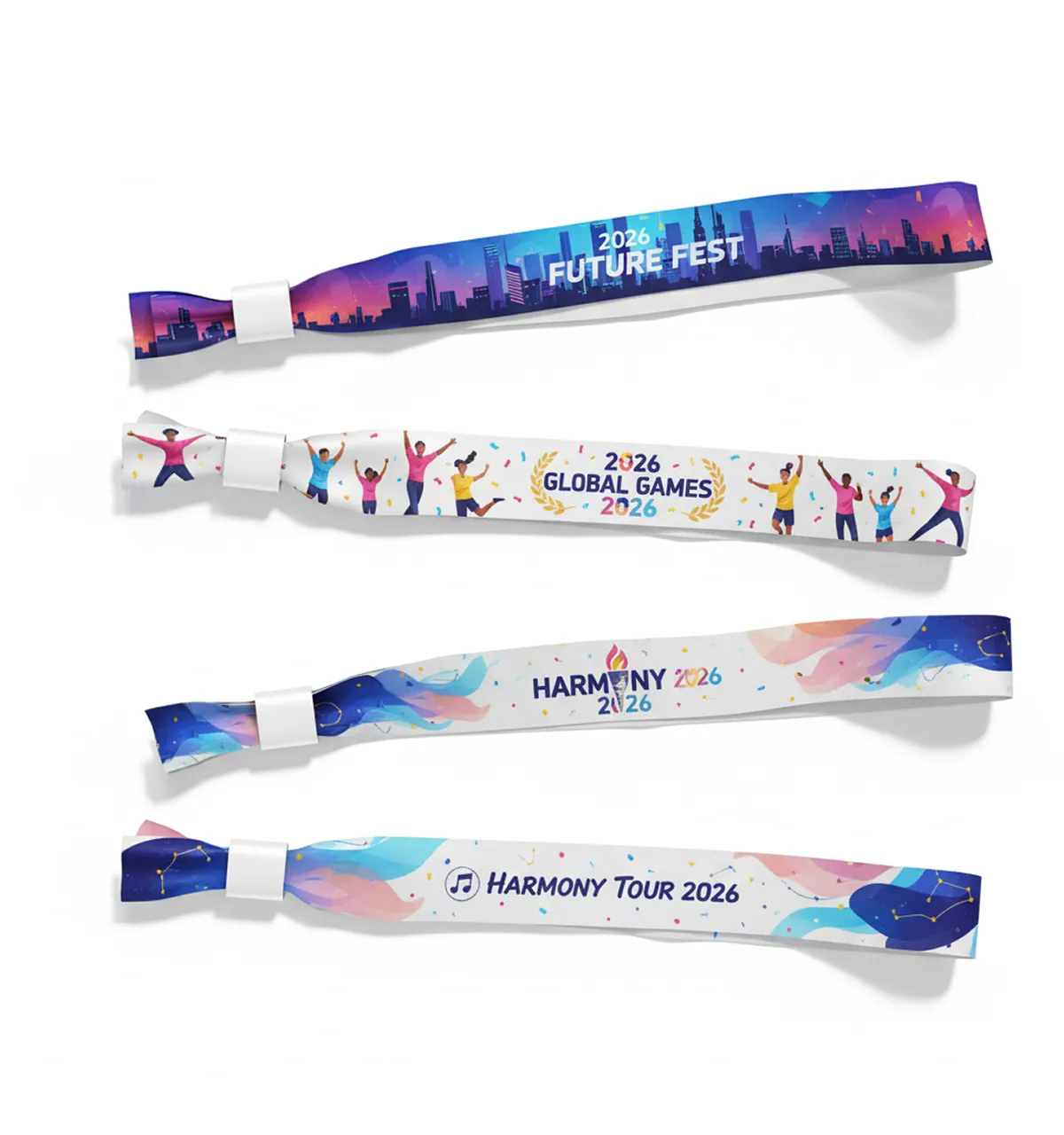 Cloth wristbands offer premium comfort for extended wear (3-10 days), making them the most comfortable option for multi-day events. They feature superior print quality for vibrant, detailed designs and have a professional, upscale appearance that elevates your event's image. Plus, they're eco-friendly—perfect for sustainability-focused events that want to make a positive impression.